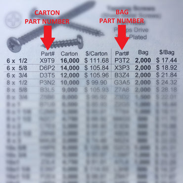 Each catalog item has the carton and bag quantity part numbers